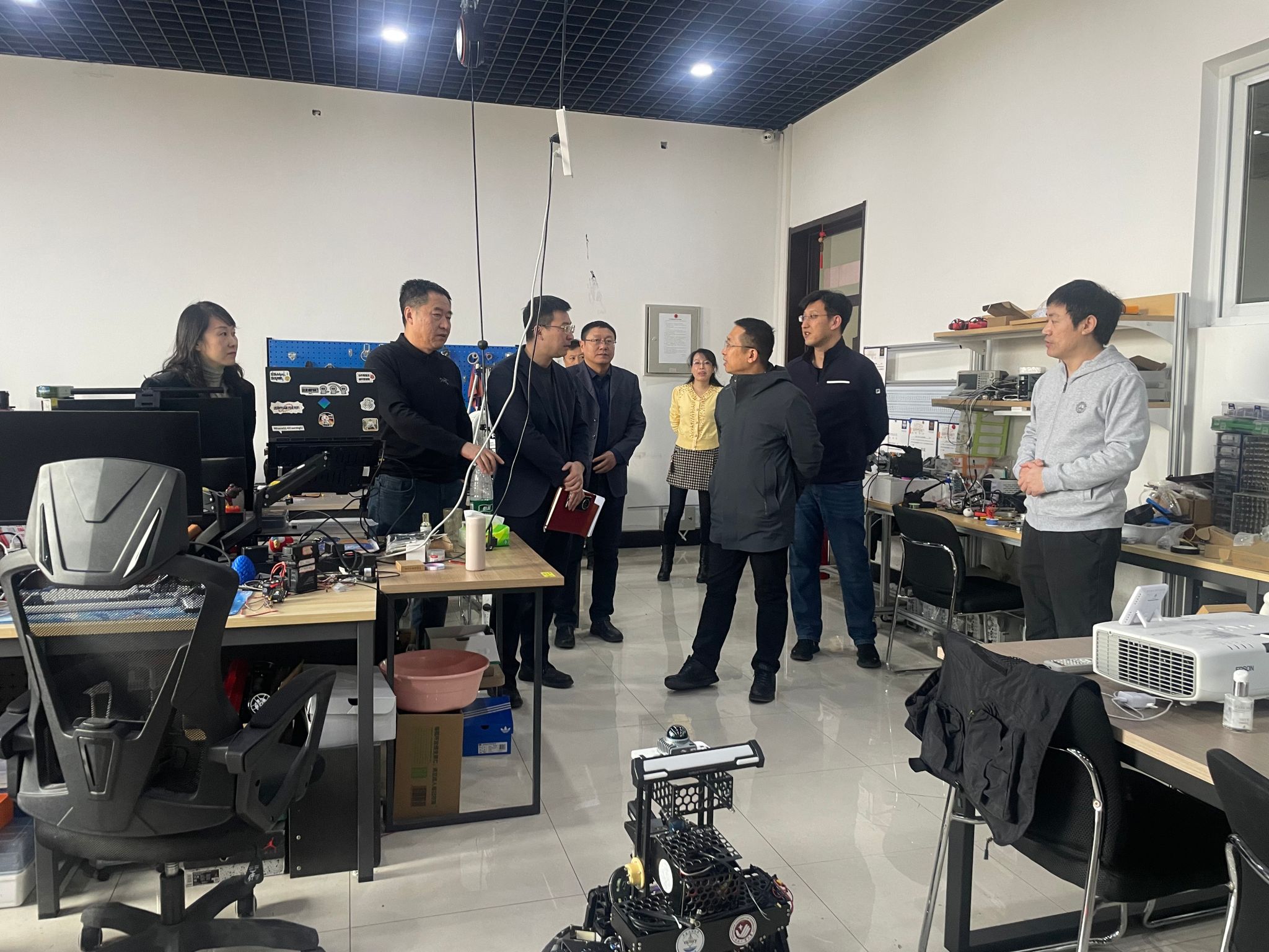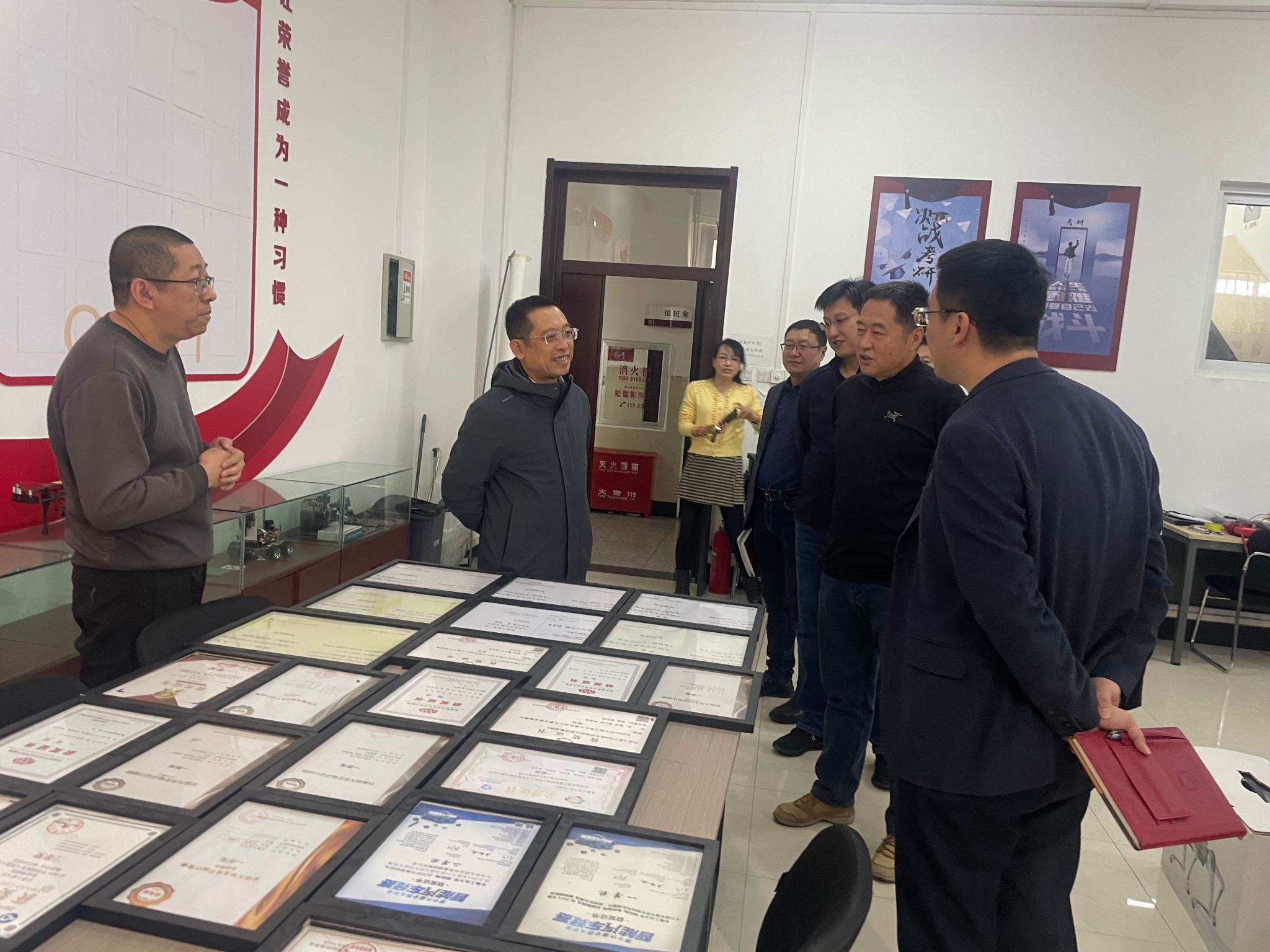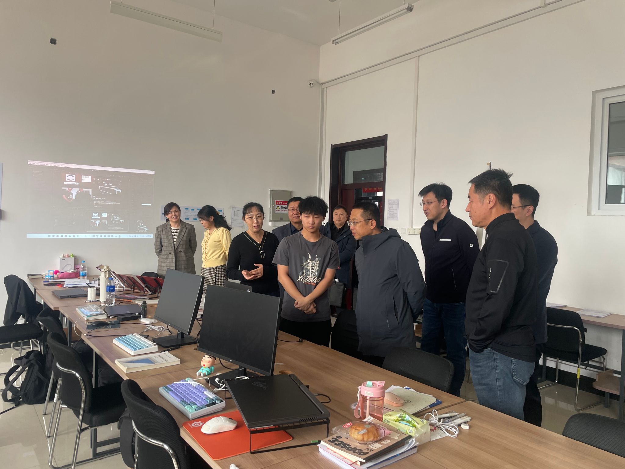 付跃刚校长一行首先来到学院一楼学生竞赛实验室走访调研。2025年,学院学生在“挑战杯”、全国大学生机器人大赛、ACM竞赛等高水平赛事中获得国家级奖项68项,橱窗中展示的智能机器人、嵌入式系统等饱含巧思的参赛作品,生动记录着竞赛团队从“跟跑”到“领跑”的跨越式成长历程。付校长对实验室构建的“基础训练—项目实战—竞赛磨砺”阶梯式培养体系及近年来取得的丰硕育人成果给予充分肯定。他指出,学生竞赛实验室是培养学生工程实践能力和创新精神的重要阵地,计算机学院要持续发挥好这一平台优势,将草榴社区